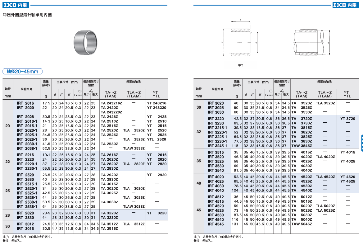 IKO代理商特价型号:IKO IRT 系列包含:IRT1512、IRT1515、IRT1516、IRT1517、IRT1519、IRT1520、IRT1525、IRT1716、IRT1720、IRT1730、IRT2025、IRT2030、IRT3025、IRT3030、IRT4045等不同型号滚针轴承 内圈IKO厂家促销。