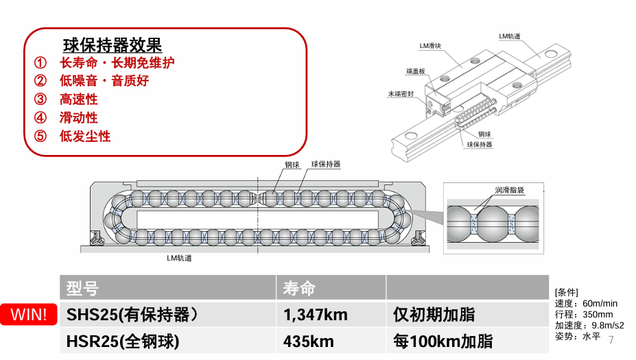 球保持器型LM导轨的钢球通过球保持器保持,从而消除了钢球之间的相互摩擦,使钢球均匀排列来进行运动。另外,钢球循环部与球保持器之间的润滑脂袋中存有润滑脂,油膜不容易破裂
