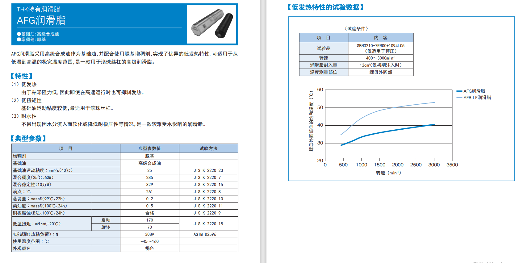AFG润滑脂采用高级合成油作为基础油,并配合使用脲基增稠剂,实现了优异的低发热特性,可适用于从低温到高温的极宽温度范围,是一款用于滚珠丝杠的高级润滑脂。