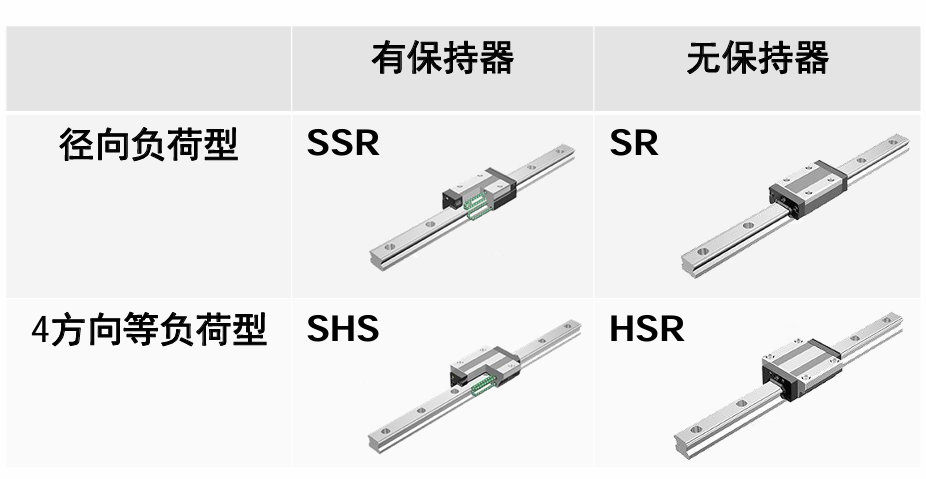 球保持器型LM导轨的钢球通过球保持器保持,从而消除了钢球之间的相互摩擦,使钢球均匀排列来进行运动。另外,钢球循环部与球保持器之间的润滑脂袋中存有润滑脂,油膜不容易破裂