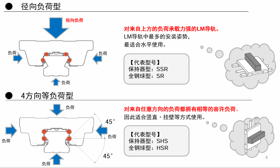对构造差异很大的「径向负荷型」「4方向等负荷型」的特征进行说明。根据承受载荷的方向,型号选择会发生改变。
