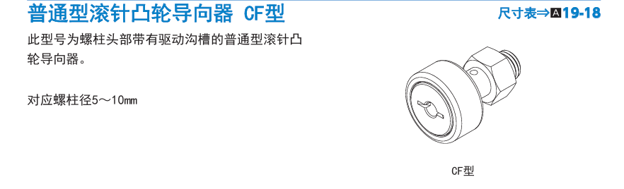 CF10 系列:CF10 - A、CF10M - A、CF10 - 1 - A、CF10 - 1M - A、CF10 - 1MR - A、CF10 - 1MUU - A、CF10 - 1MUUR - A、CF10 - 1R - A、CF10 - 1UU - A、CF10 - 1UUR - A、CF10 - 1VMUU - A、CF10 - 1VUU - A、CF10 - UUA、CF10 - MUUA、CF10 - VUUA、CF10 - MUUR - A等不同型号滚针凸轮导向器轴承。